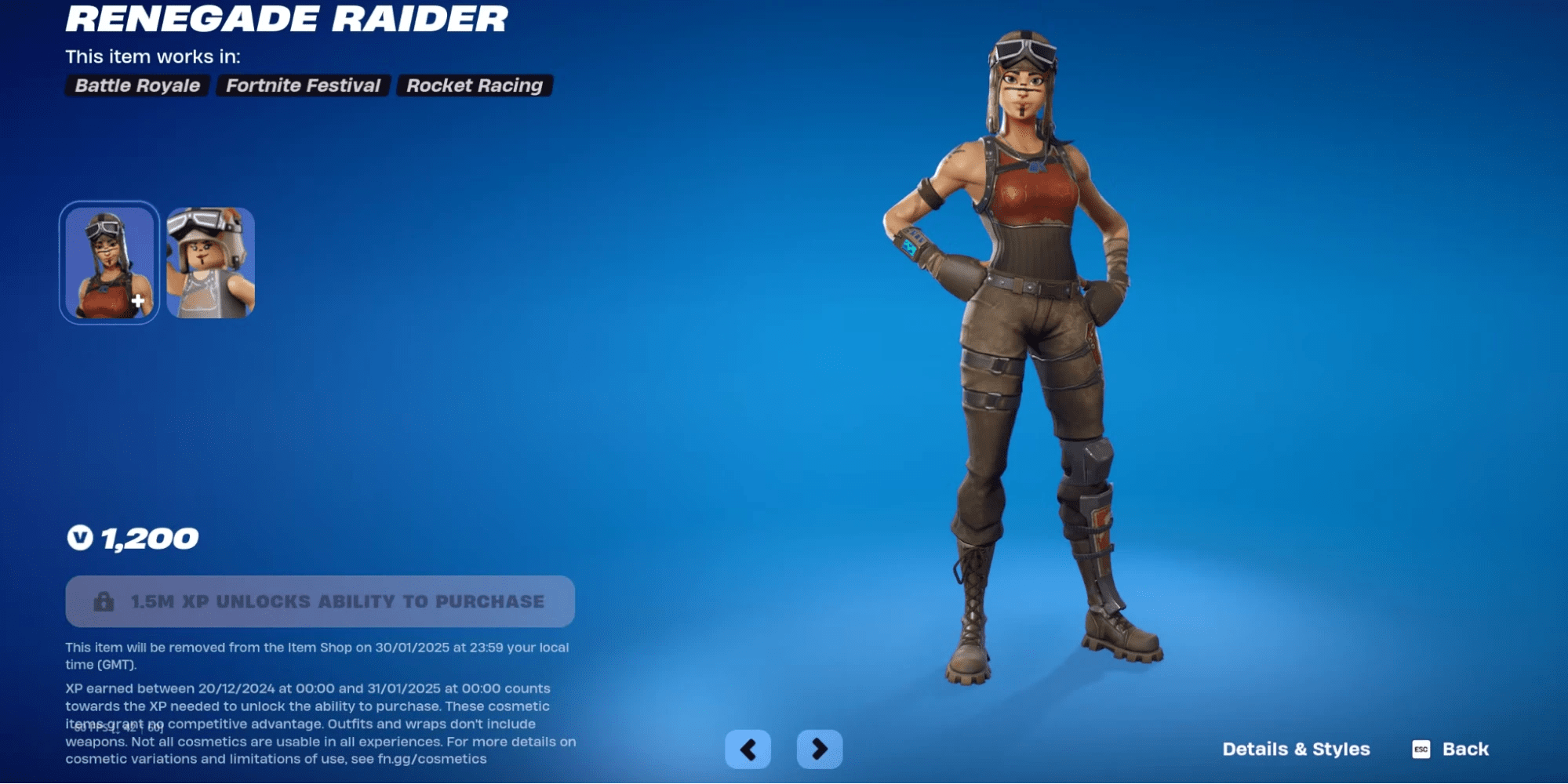Released in the same season as Aerial Assault Trooper, Renegade Raider required Level 20 and 1,200 V-Bucks to unlock.