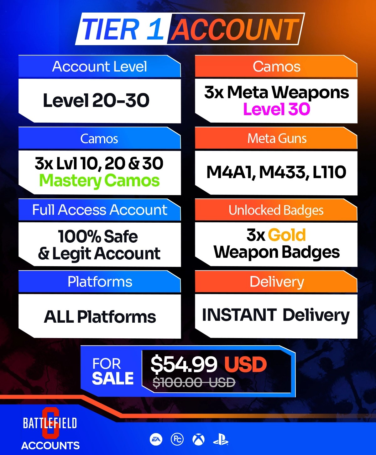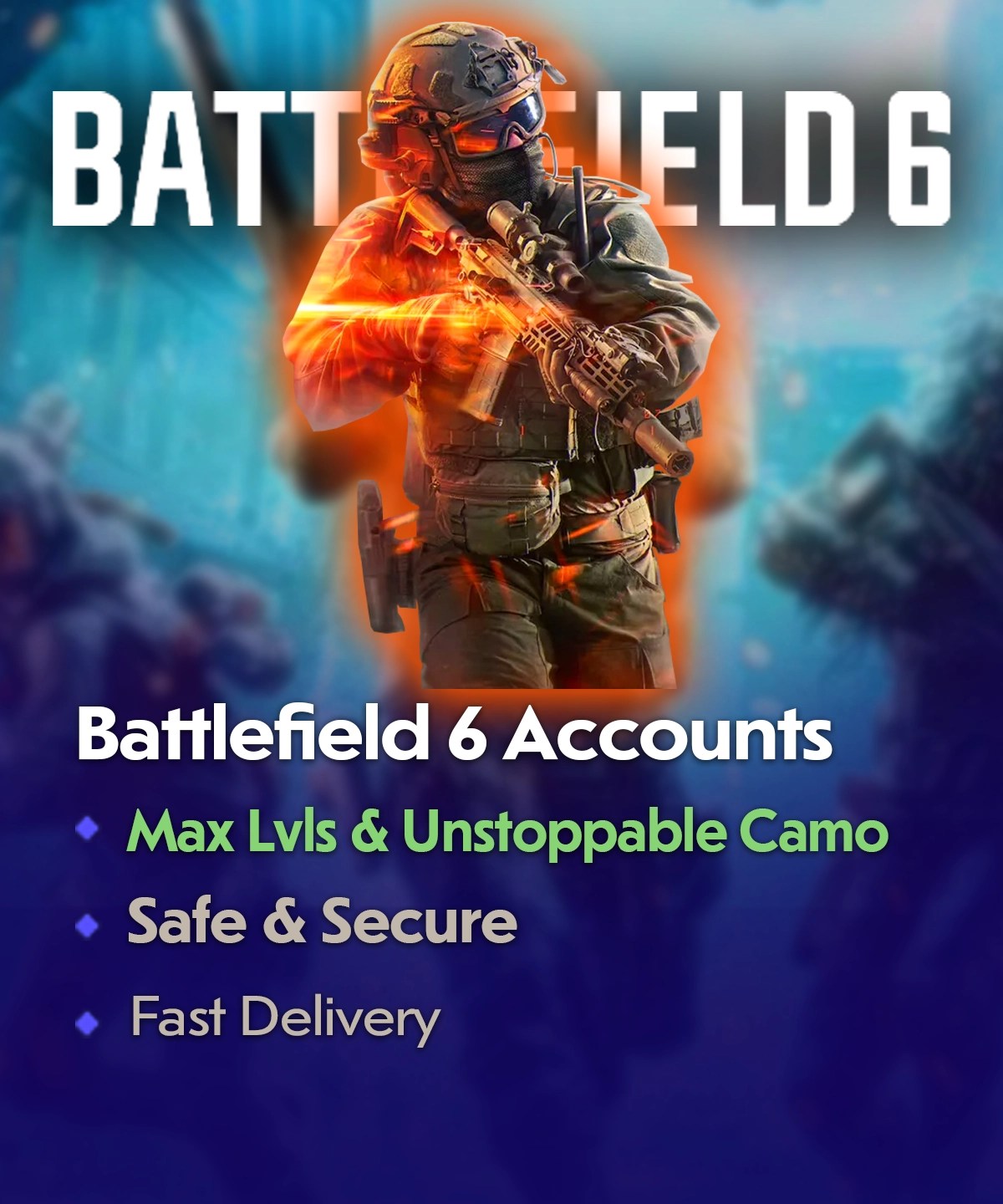 Buy Battlefield 6 Accounts — exclusive Unstoppable Force Camo, Lvl50 weapons, high ranks & meta guns included. Instant delivery on Xbox, PlayStation & PC.