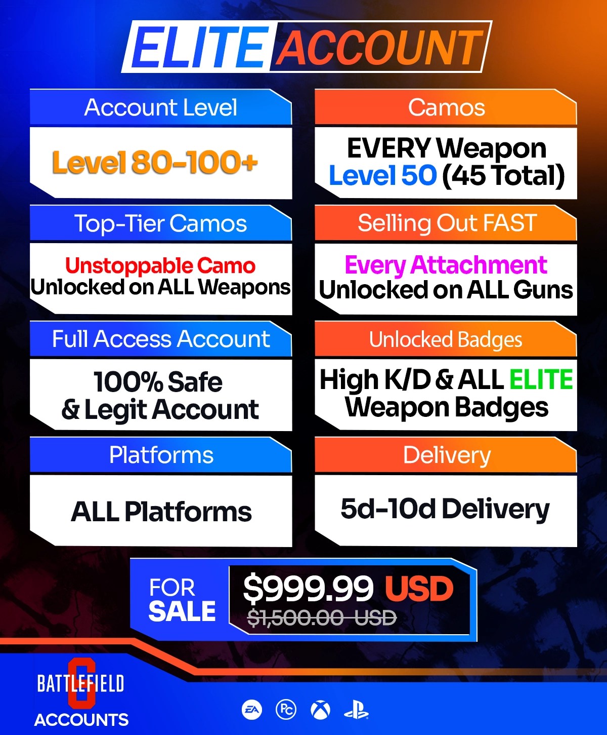 Our limited elite BF6 accounts are best for you if you want instant, total endgame flexibility.