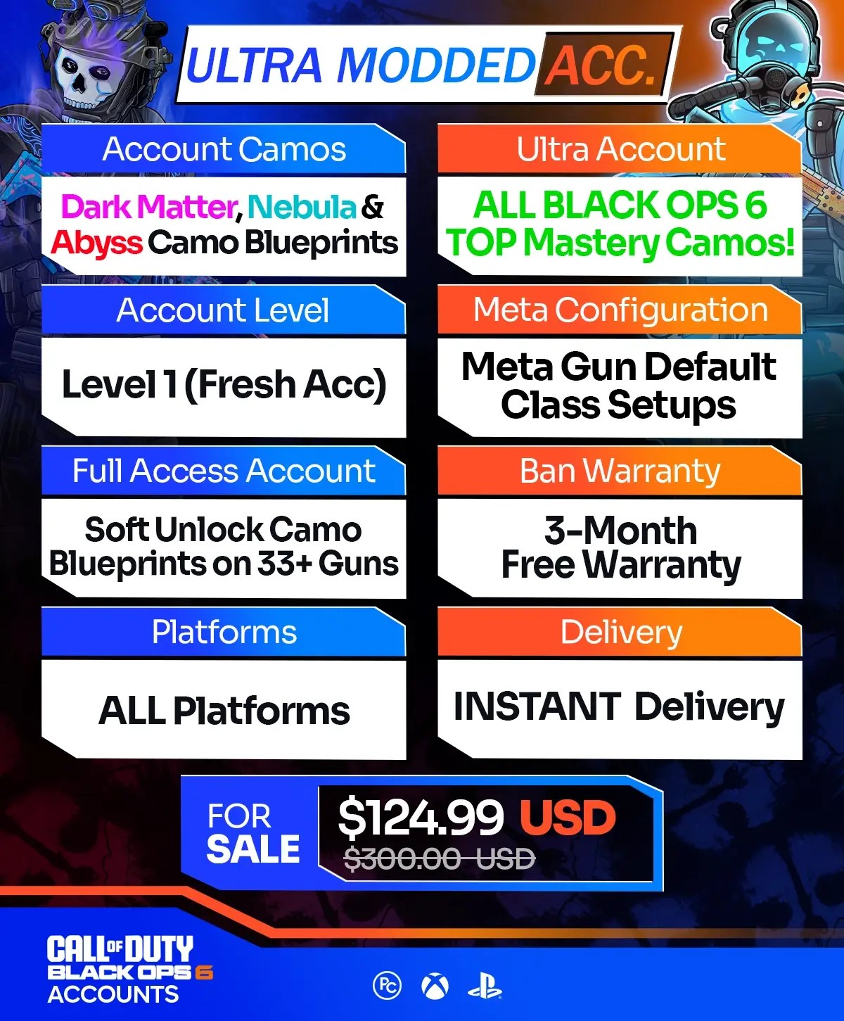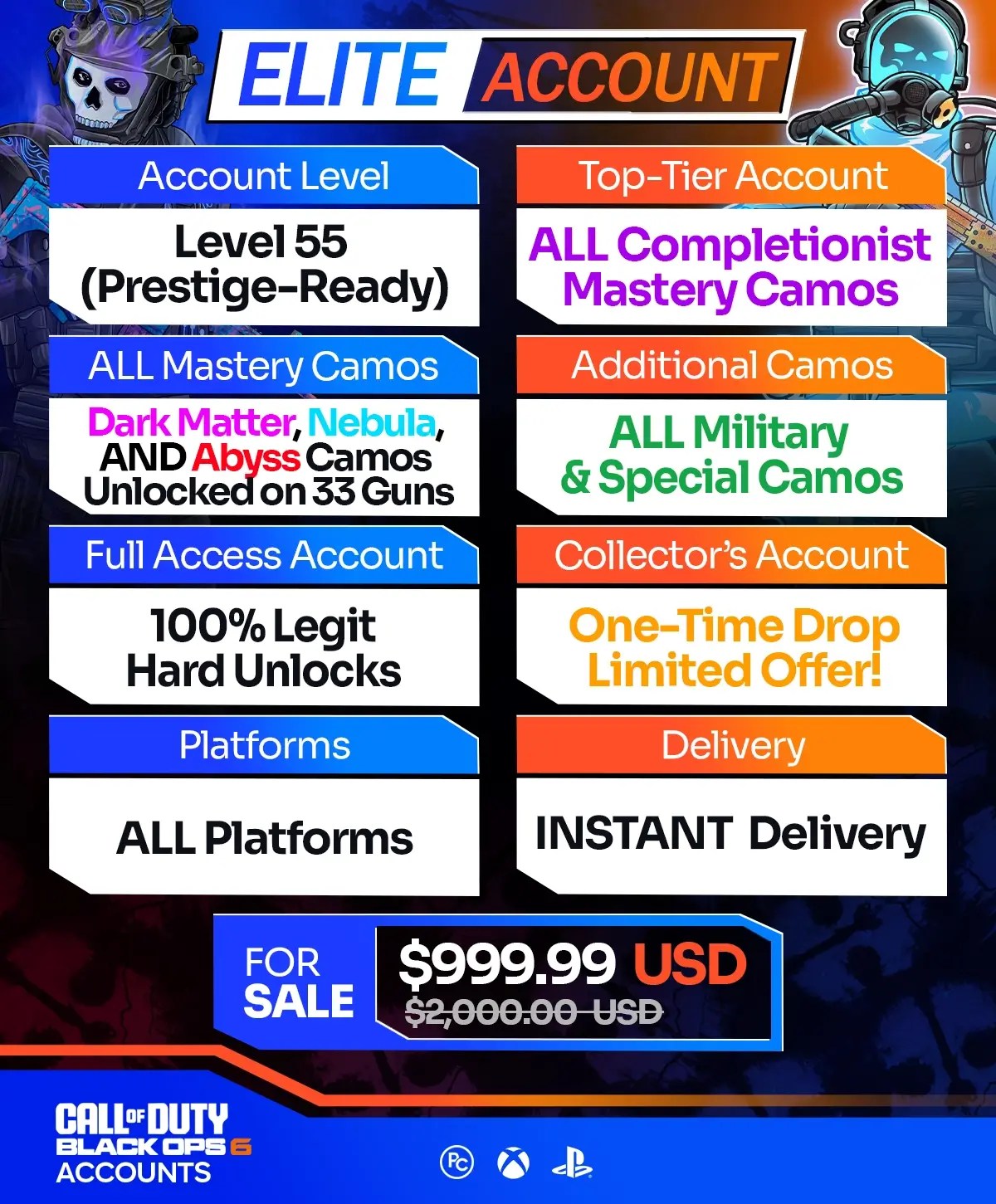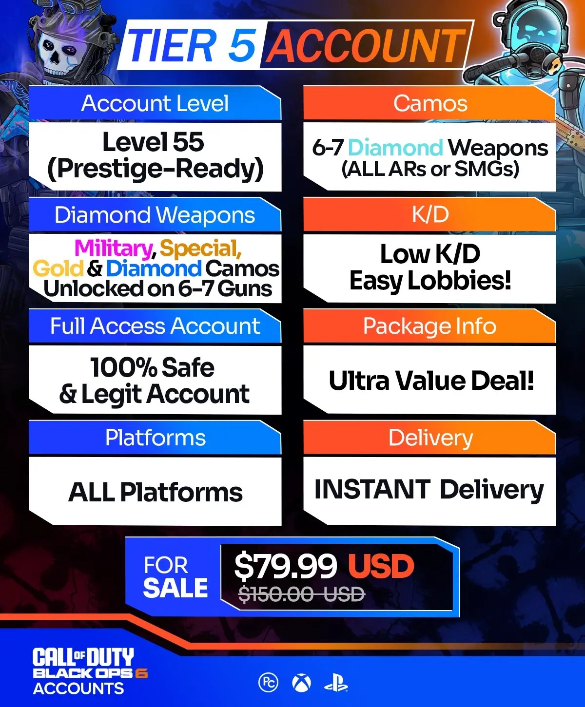 We offer a wide selection of Call of Duty BO6 Accounts for sale across Xbox, PS4, PS5, PC, and Warzone Mobile. Furthermore, all of our accounts come at unbeatable prices, with instant delivery and a moneyback guarantee. If you want to enjoy BO6 with the most exclusive camos on a high-level account, our packages are perfect for you. Meanwhile, unlocking top-tier BO6 mastery camos typically takes months of relentless grinding, especially for casual players that don’t have time to waste. Whereas with our instant delivery BO6 accounts, you can achieve it all in just a few clicks.