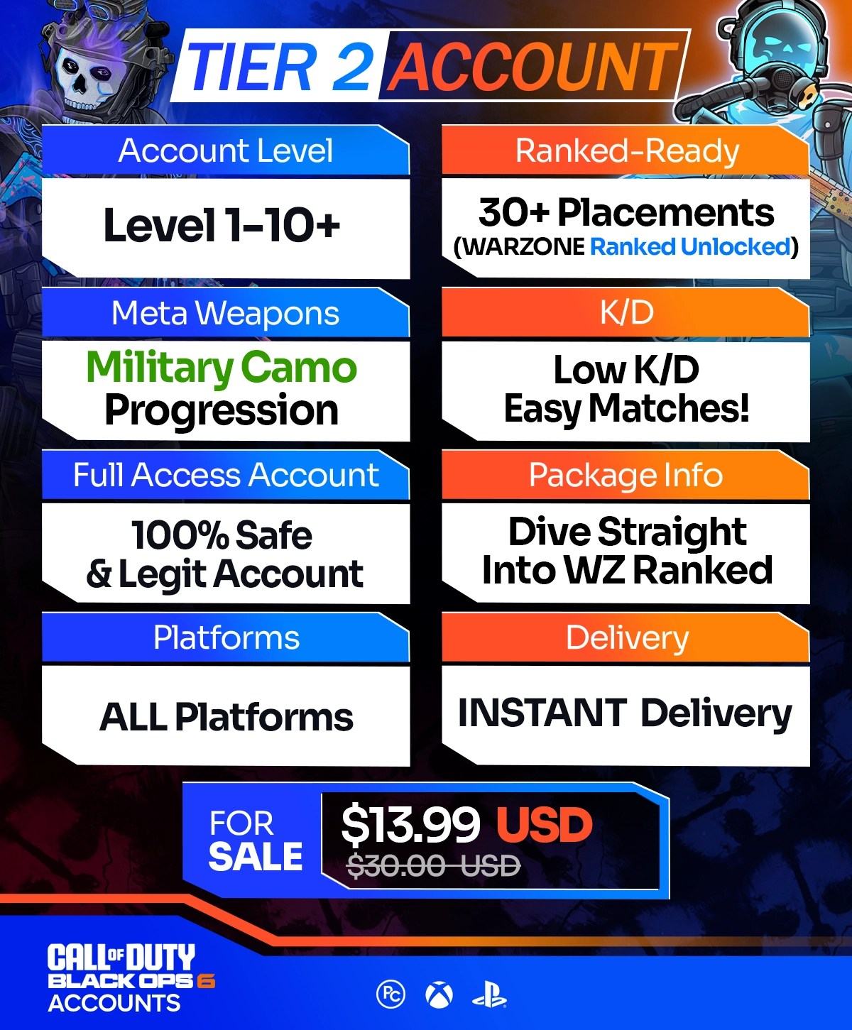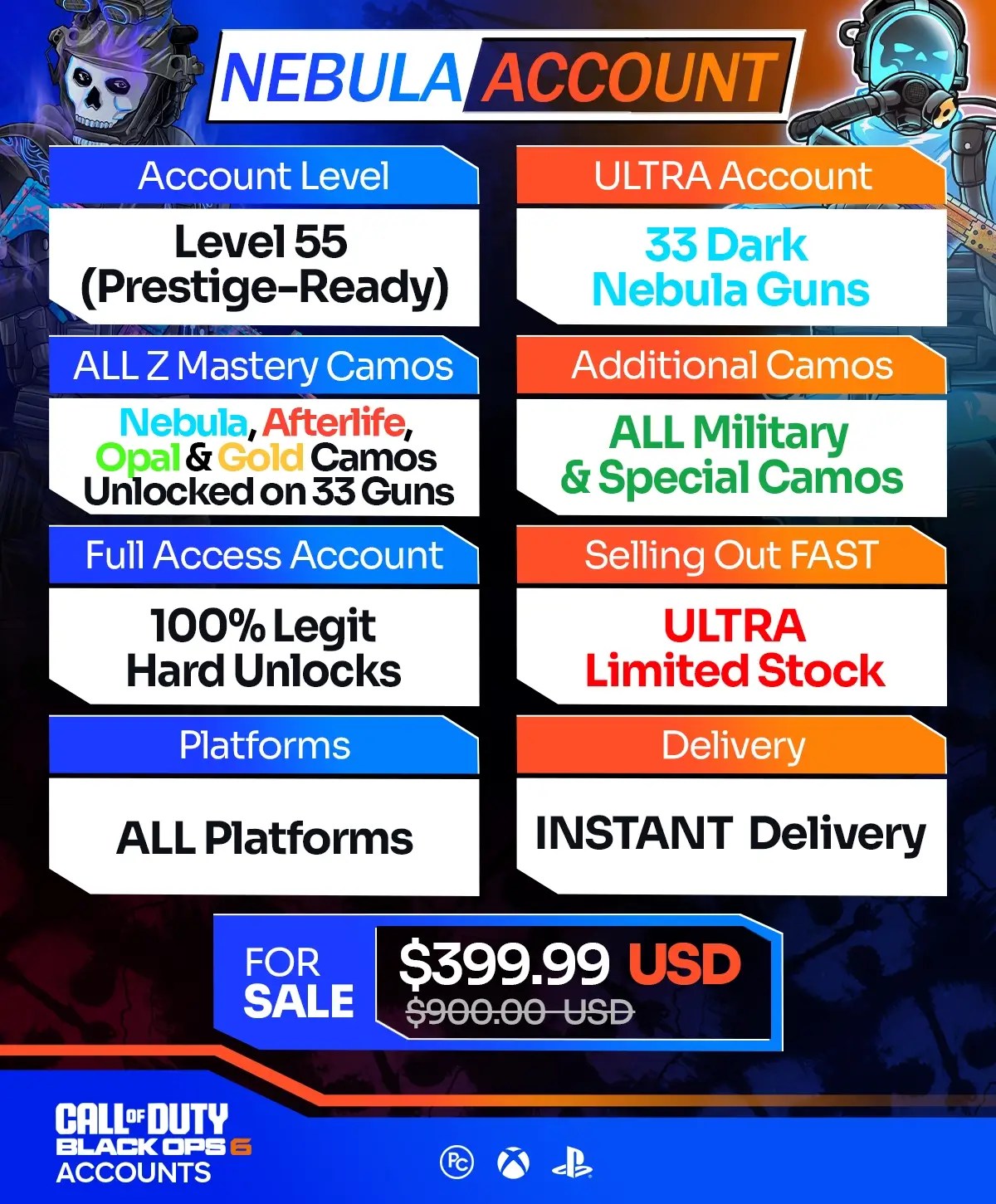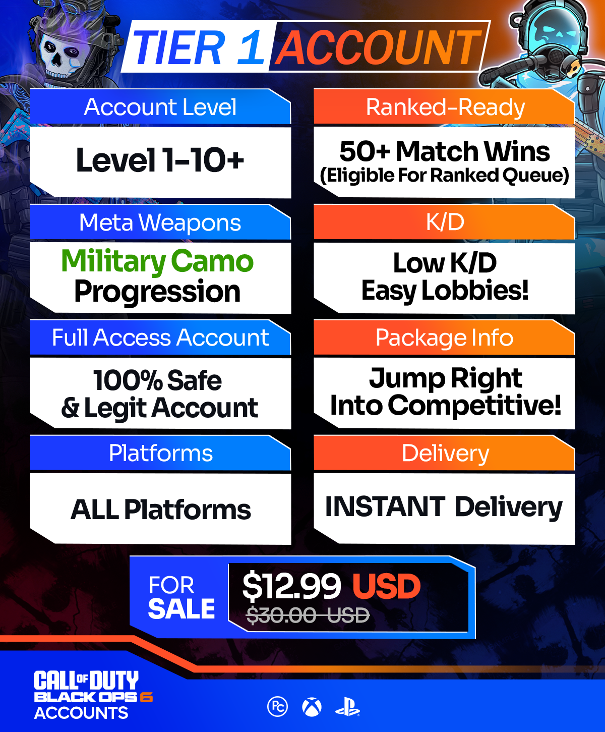 We offer a wide selection of Call of Duty BO6 Accounts for sale across Xbox, PS4, PS5, PC, and Warzone Mobile. Furthermore, all of our accounts come at unbeatable prices, with instant delivery and a moneyback guarantee. If you want to enjoy BO6 with the most exclusive camos on a high-level account, our packages are perfect for you. Meanwhile, unlocking top-tier BO6 mastery camos typically takes months of relentless grinding, especially for casual players that don’t have time to waste. Whereas with our instant delivery BO6 accounts, you can achieve it all in just a few clicks.