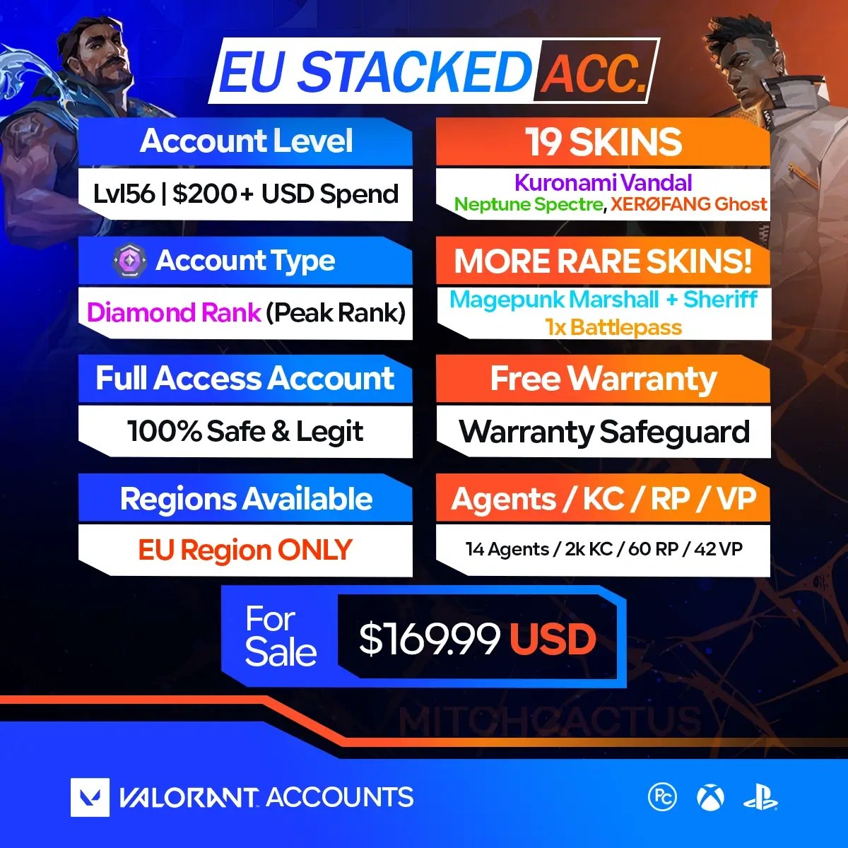 Buy Valorant Accounts with Rare Skins and Ranked-Ready Smurfs at MitchCactus. Enjoy 100% safe, full-access accounts delivered instantly for all platforms.